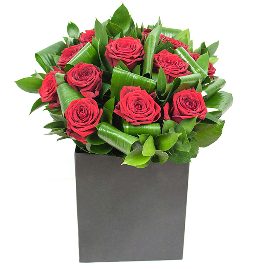 Indulge in the elegance of our premium bouquet, expertly crafted with radiant red roses, complemented by stylish aspidistra leaves and ruscus. Each flower is hand-picked for its superior quality, ensuring that every bloom is fresh and brilliantly vibrant.